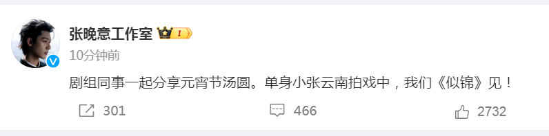 2月19日中午,@张晚意工作室 发文回应:“剧组同事一起分享元宵节汤圆。单身小张云南拍戏中,我们《似锦》见!”